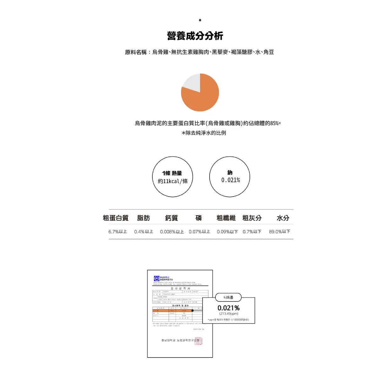 主要成分:烏骨雞、雞胸肉(非抗生素)、黑藜麥、褐藻醣膠、水、角豆