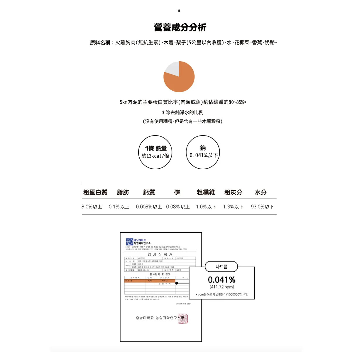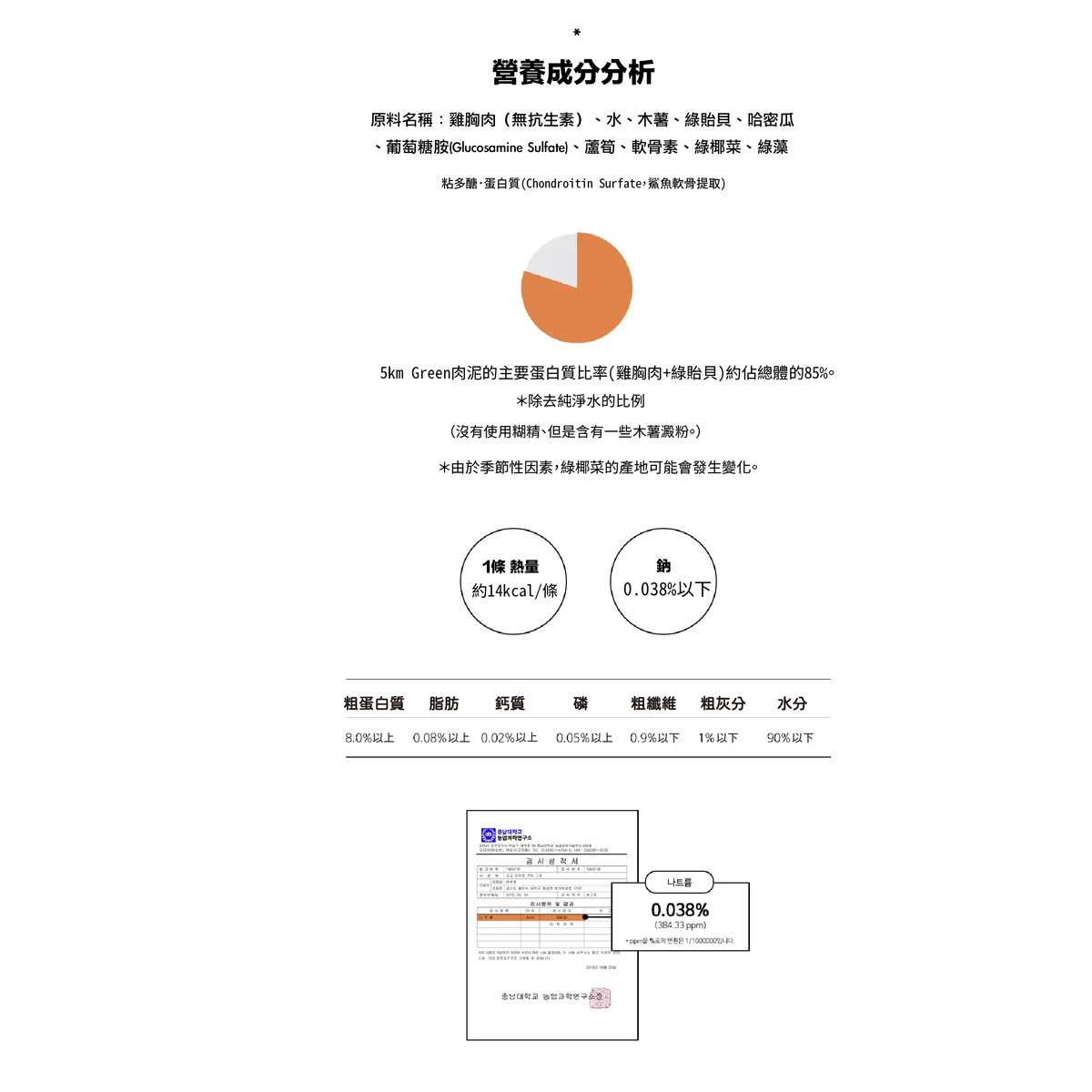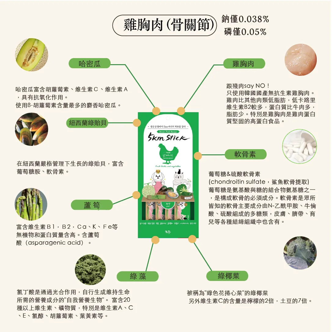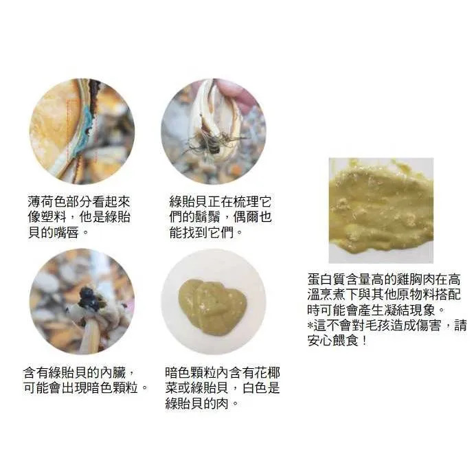 主要成分:雞胸肉(非抗生素)、綠唇貽貝、木薯、哈密瓜、葡萄糖胺、綠藻、綠花椰、蘆筍、水