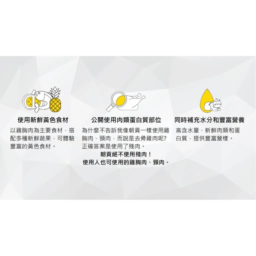 主要成分:雞胸肉(非抗生素)、甜南瓜、木薯、水、南瓜、鳳梨、薑黃