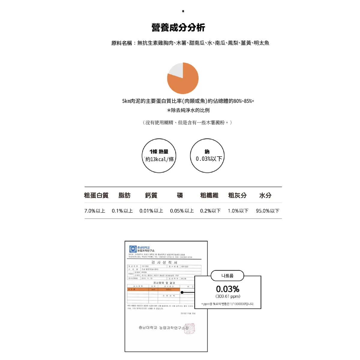 主要成分:鱈魚(挪威)、甜南瓜、干明太魚、南瓜、鳳梨、薑黃、木薯、水