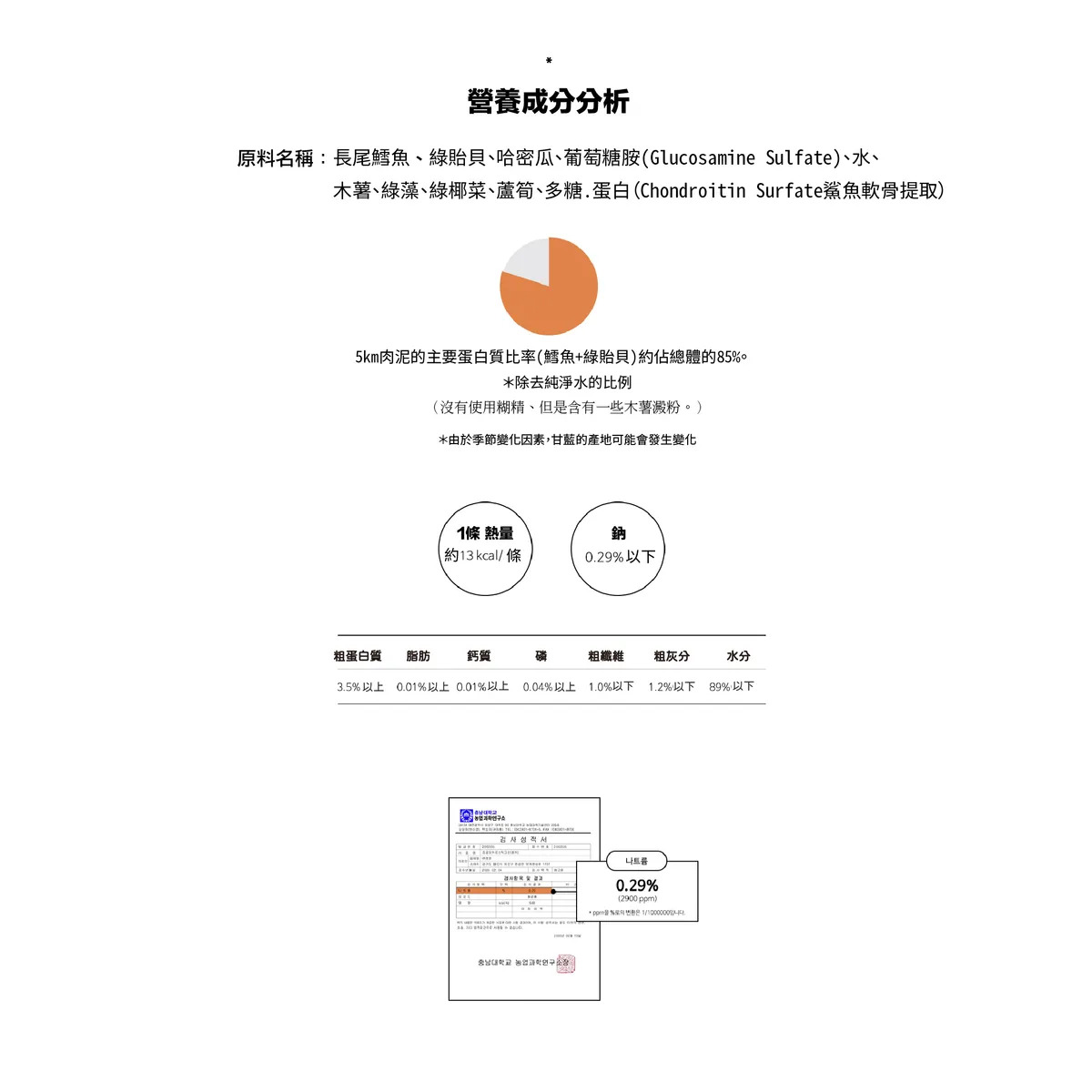 主要成分:雞胸肉(非抗生素)、綠貽貝、木薯、水、哈蜜瓜、葡萄糖胺、綠藻、綠椰菜、蘆筍、軟骨素