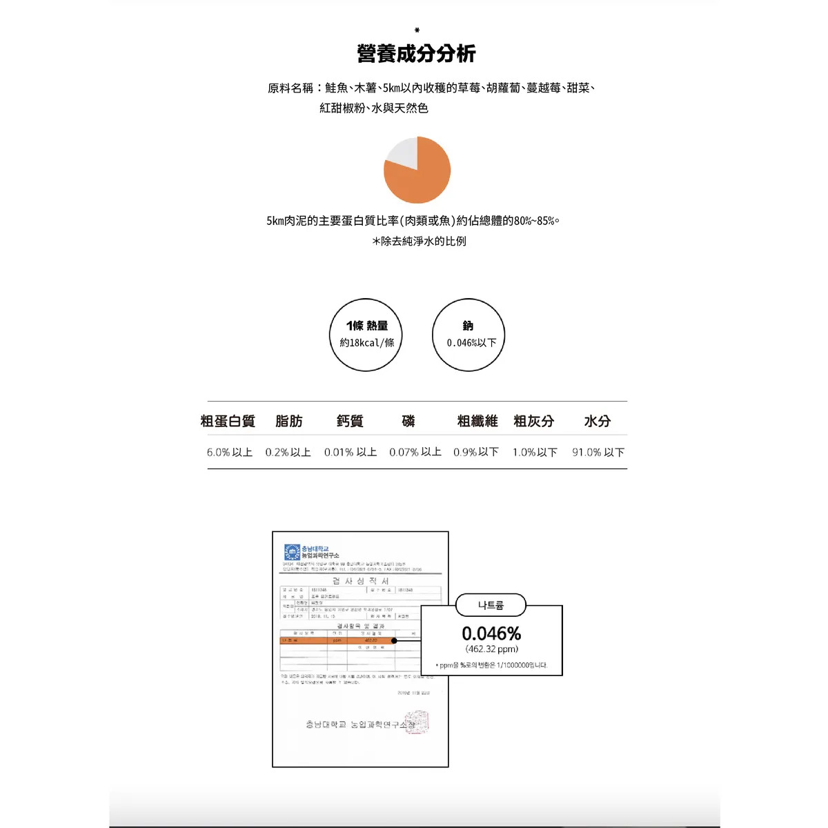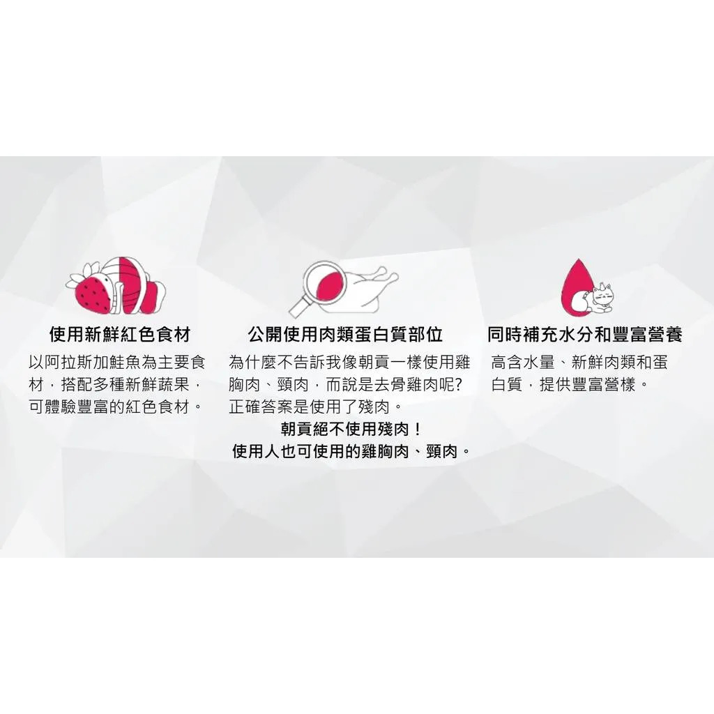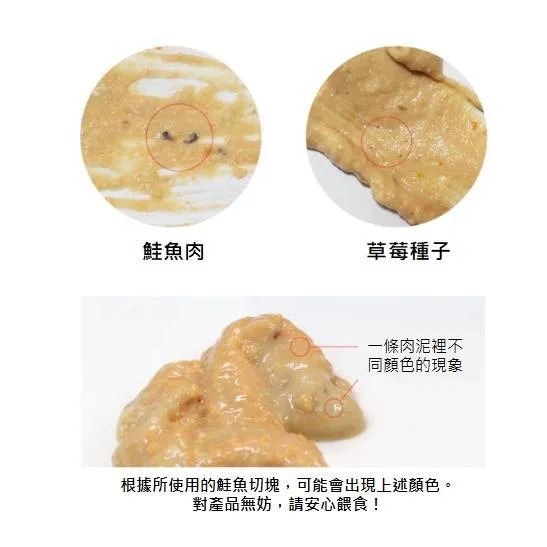 主要成分:鮭魚、草莓、蔓越莓、胡蘿蔔、甜菜、紅甜椒粉、木薯、水與天然色