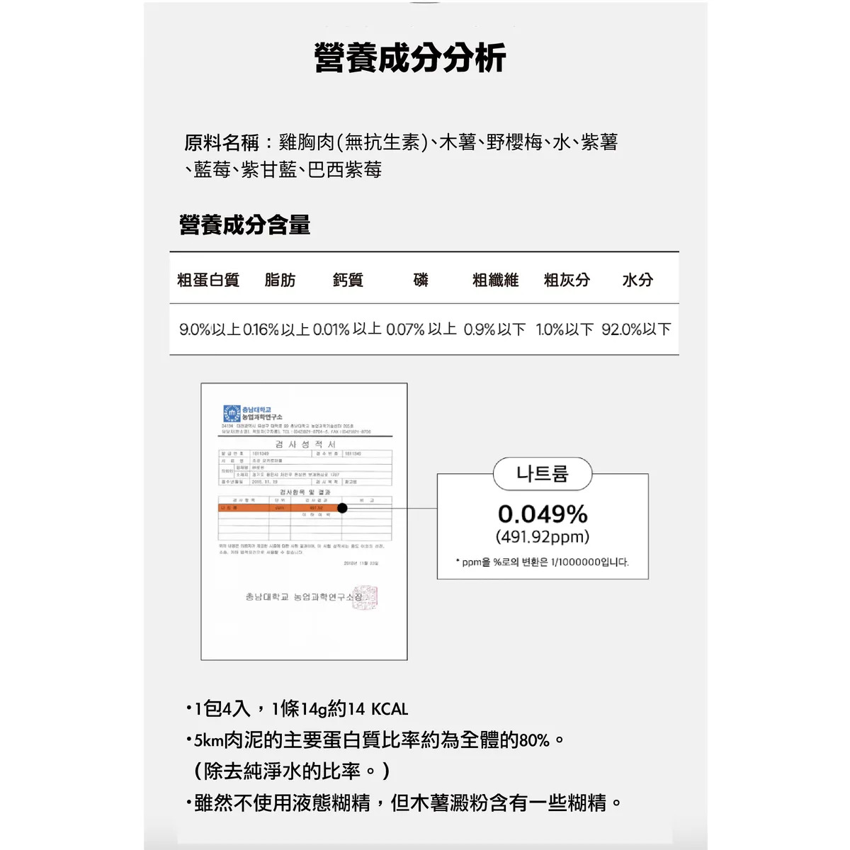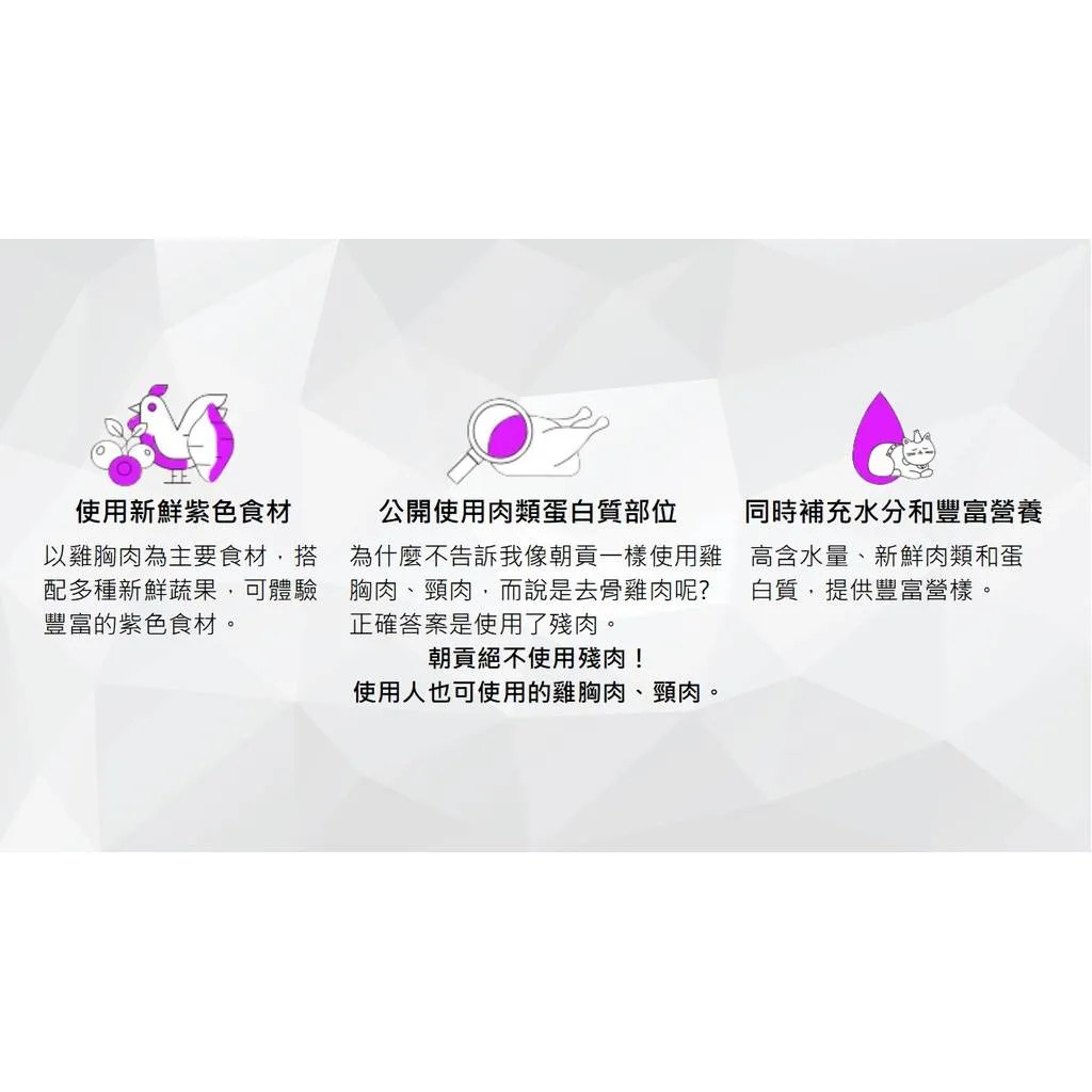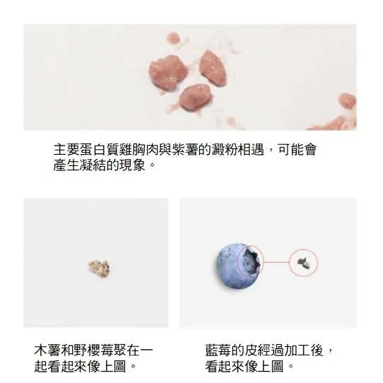 主要成分:雞胸肉(非抗生素)、木薯、野櫻莓、水、紫薯、紫甘藍、巴西紫莓